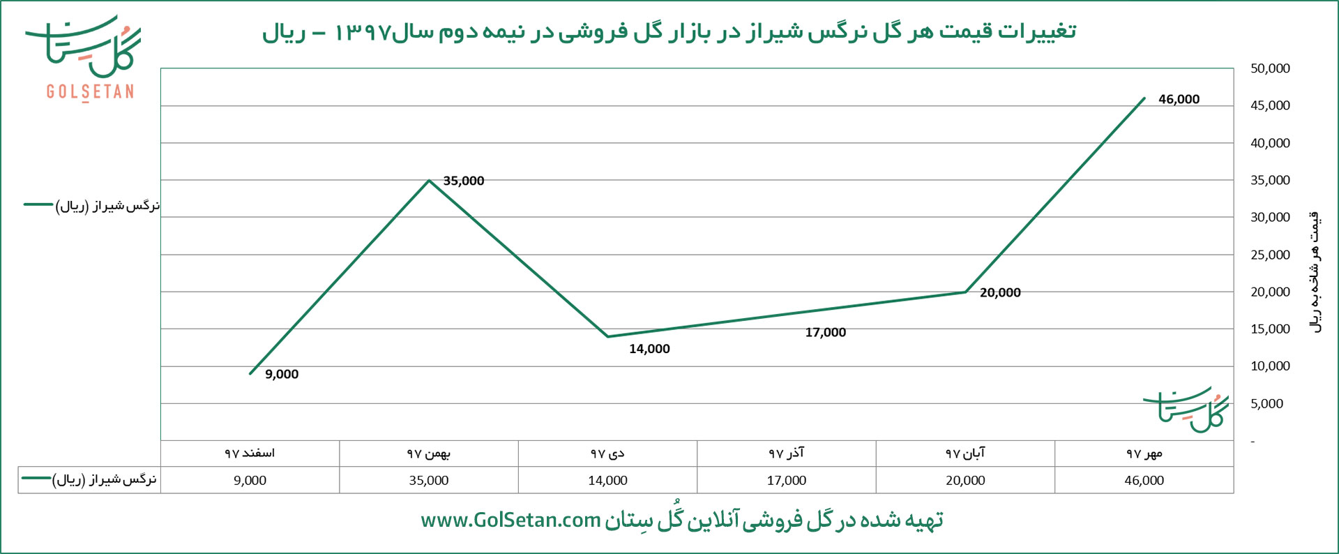 نمودار قیمت گل نرگس در گلفروشی ها در سال 1397 که توسط تیم گُلسِتان تهیه گردیده است (قیمتها به ریال می باشد)