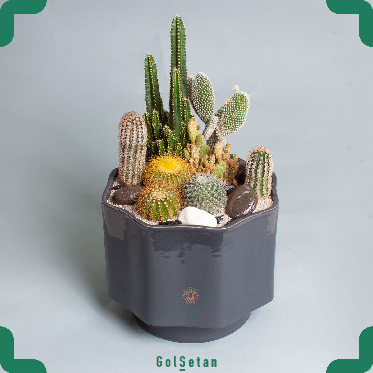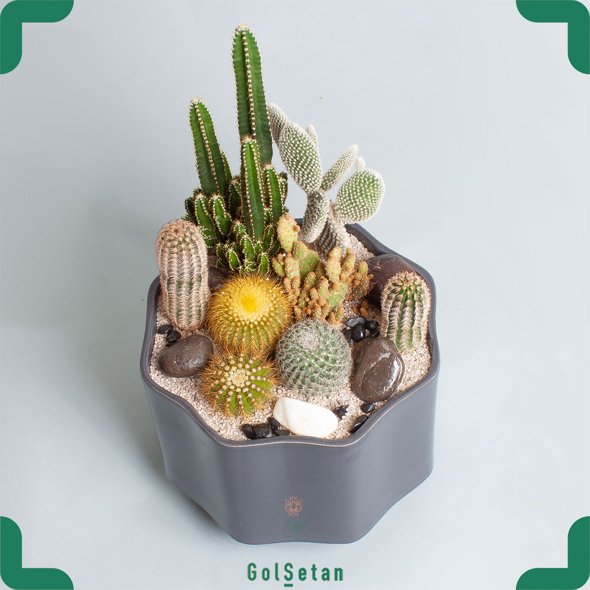 - انواع مختلف کاکتوس در طرحهای مختلف که به زیبایی درون گلدان در کنار یکدیگر جای گرفتهاند.