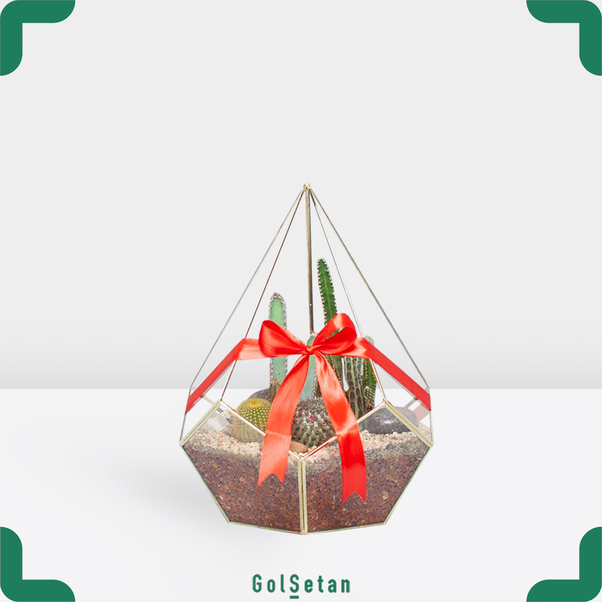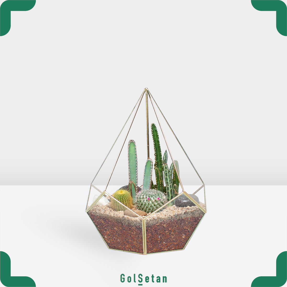 کاکتوس ها به دلیل شکل خاصی که دارند و تنوع بسیار زیاد، گیاهان بسیار شگفت انگیزی محسوب می شوند. این تراریوم از نوع تراریوم های نیمه باز است و شکل الماسی دارد که جلوه خاصی به آن می بخشد. می توانید این تراریوم را به عنوان یک هدیه بسیار خاص برای مناسبت های مختلف به دوستان و عزیزان خود هدیه دهید و یا در محیط خانه خود از آن نگهداری کرده و از تماشای آن لذت ببرید.