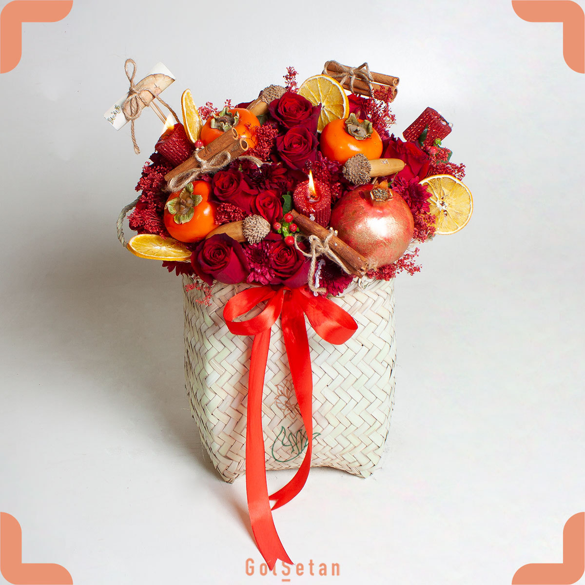 در میان شیوههای گل آرایی چند سالیست که از باکسهای گل استفاده میکنند و این جعبههای گل با دیزاینهای مختلف به هدیهای شیک و جذاب تبدیل شده است. باکس گل و میوه گُلسِتان نیز با استفاده از نوزده شاخه رز هلندی قرمز، دو دسته داوودی قرمز جذاب، به همراه یک دسته هیپو قرمز در کنار مقداری سبزه ریزه قرمز ساخته شده است. افزون بر این گلهای خوشرنگ از میوههای پاییزی مثل انار، خرمالو، پرتقال خشک و غیره نیز استفاده شده است. همچنین گفتنی است که در کنار همه اینها یک عدد فال حافظ در این باکس زیبا قرار دارد تا وصف حال شما را بیان کند. این باکس میتواند با ظاهر زیبا و خوشمزهای که دارد یک یادبود و هدیه فراموش نشدنی باشد.
