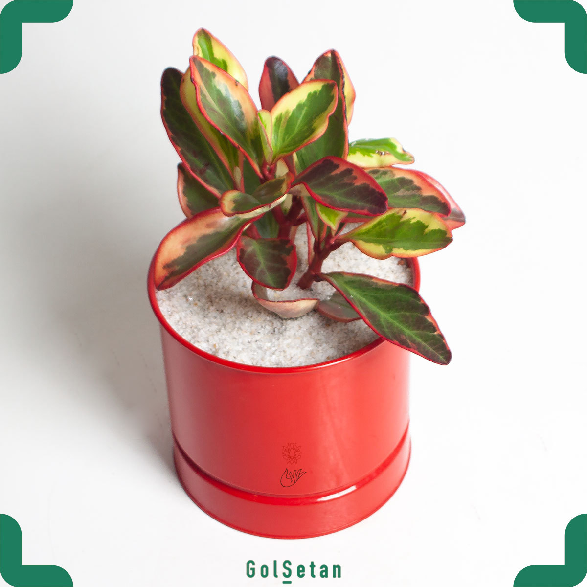 - یک گیاه پپرومیا لب ماتیکی هلندی که در داخل یک گلدان فلزی رنگ کوره ای قرار داده شده است.