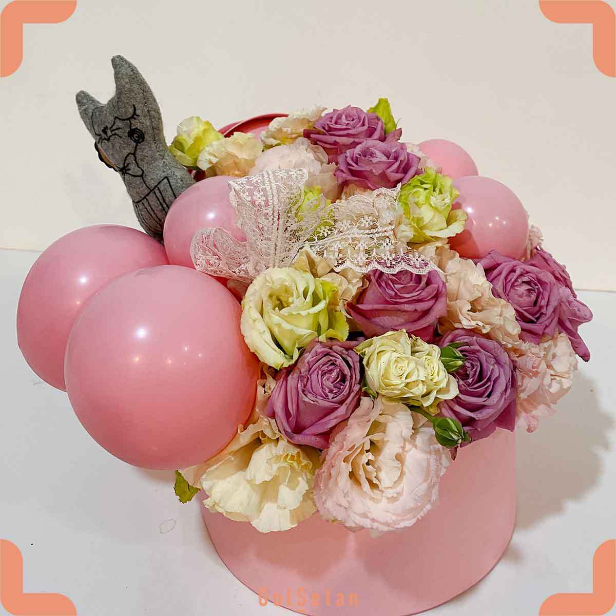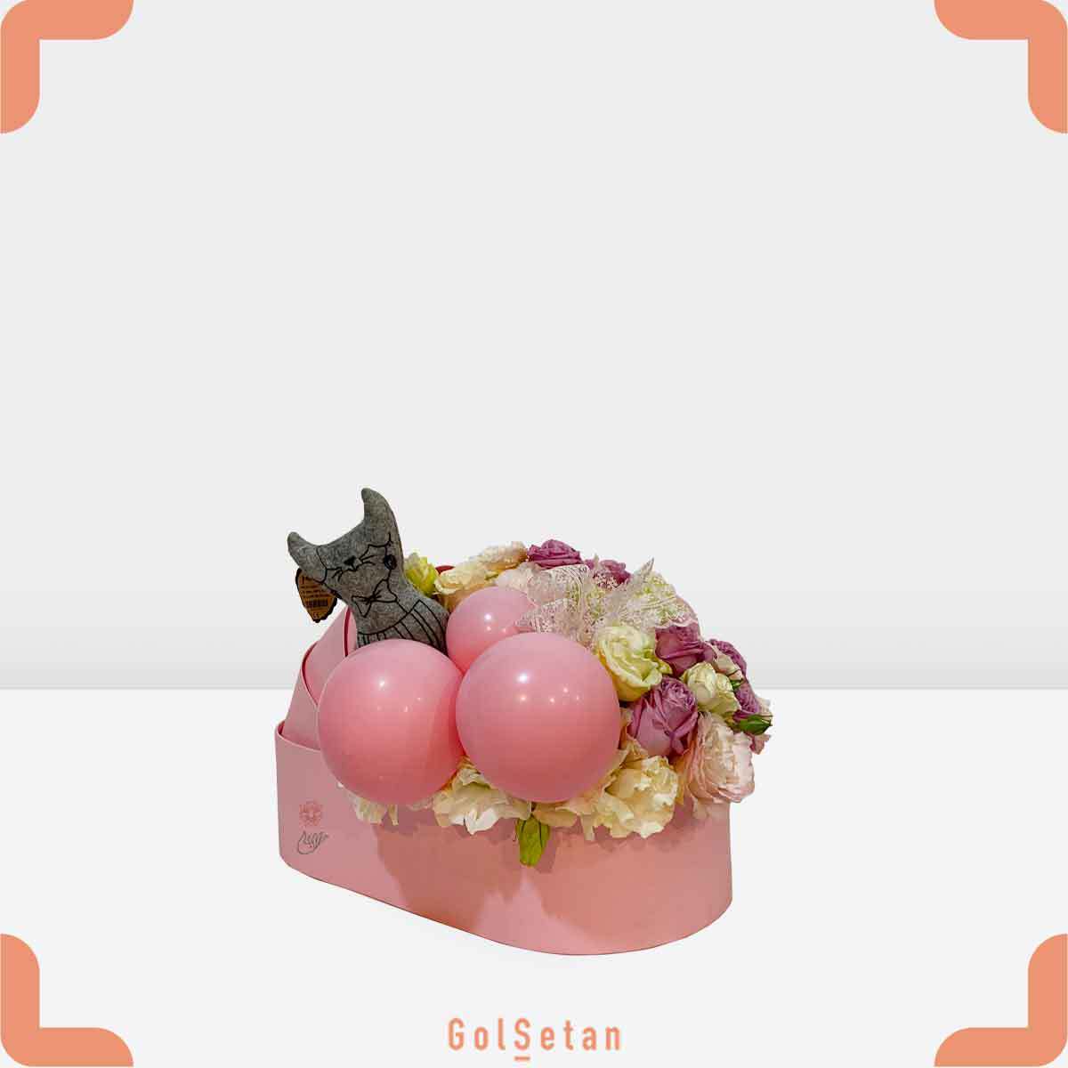 باکس رز و لیسیانتوس صورتی و بادکنک که از گل‌سِتان دریافت می‌کنید دارای مشخصات زیر است :