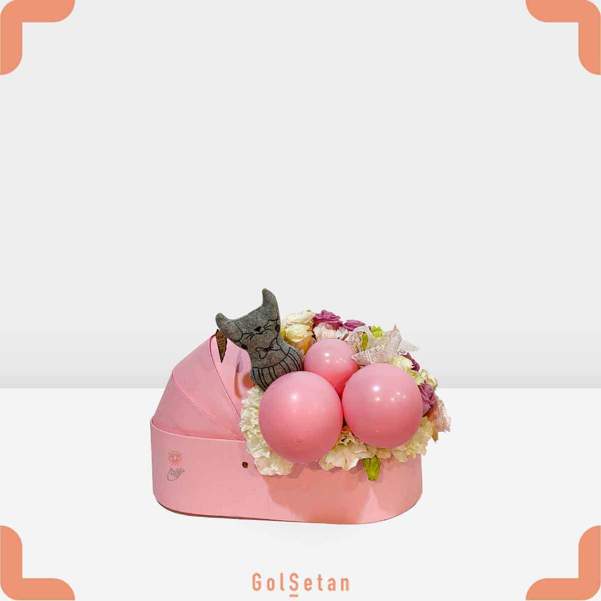 • باکس گهواره صورتی که گل‌ها، بادکنک‌ها و عروسک درون آن قرار گرفته‌اند.