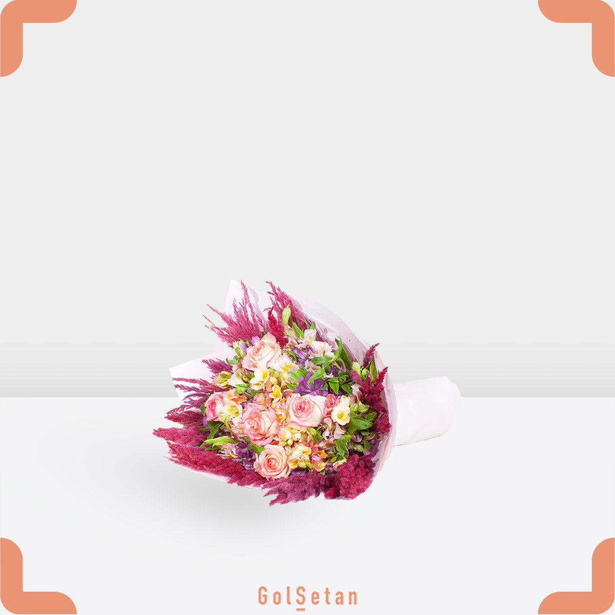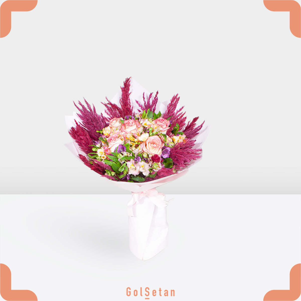 • پنج شاخه رز جمیلا صورتی، یک دسته آلسترومریا بنفش، یک دسته آلسترومریا صورتی، دو دسته فریزیا صورتی، یک دسته پامپاس صورتی