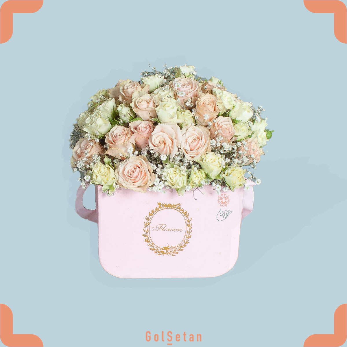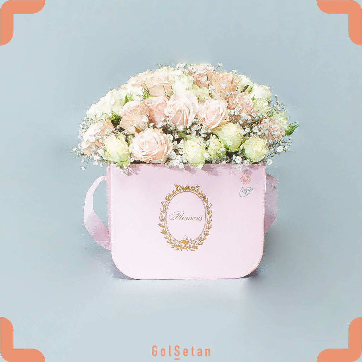 - باکس مقوایی صورتی که گلهای زیبا را درون خود جای داده است