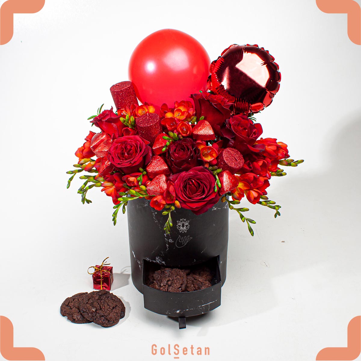 این باکس ابعادی برابر 25*35 سانتیمتر داشته و درون آن از گلهای رز هلندی به اضافه دسته گلهای فریزا قرمز، شکلات، کوکی و برای زیباتر شدن ضیافت عاشقانه شما، بادکنکهای فویلی و شمعهای اکلیلی قرمز پر شده است.